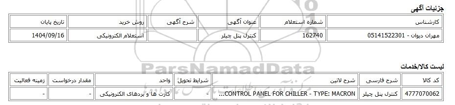 | مهران دیوان - 05141522301 | 162740 | کنترل پنل چیلر | استعلام الکترونیکی | 1404/09/16 |