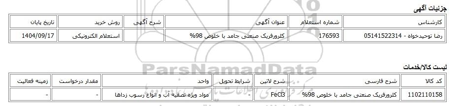 | رضا توحیدخواه - 05141522314 | 176593 | کلرورفریک صنعتی جامد با خلوص 98% | استعلام الکترونیکی | 1404/09/17 |