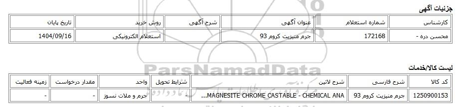 | محسن دره - | 172168 | جرم منیزیت کروم 93 | استعلام الکترونیکی | 1404/09/16 |