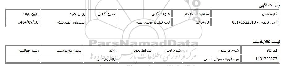 | آرش قائمی - 05141522313 | 176473 | توپ فوتبال مولتن اصلی | استعلام الکترونیکی | 1404/09/16 |