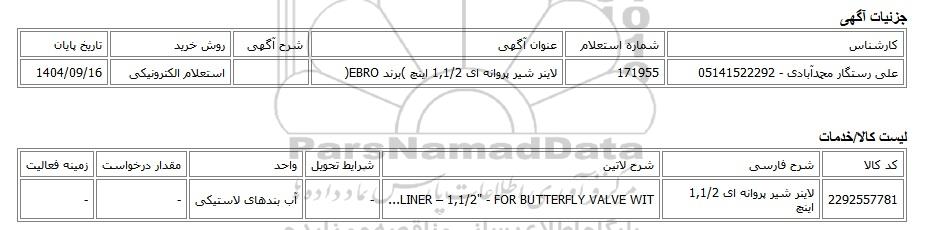 | علی رستگار محمدآبادی - 05141522292 | 171955 | لاینر شیر پروانه ای 1,1/2 اینچ )برند EBRO( | استعلام الکترونیکی | 1404/09/16 |