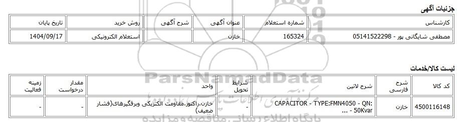 | مصطفی شایگانی پور - 05141522298 | 165324 | خازن | استعلام الکترونیکی | 1404/09/17 |