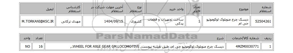 | 52504261 | دیسک چرخ منوبلوک لوکوموتیو جی ام | 1 | ساخت تجهیزات و قطعات یدکی | کشوری | 1404/09/15 | مهدی ترکانی | M.TORKANI@KSC.IR |