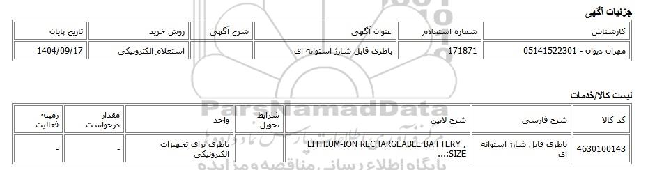| مهران دیوان - 05141522301 | 171871 | باطری قابل شارژ استوانه ای | استعلام الکترونیکی | 1404/09/17 |