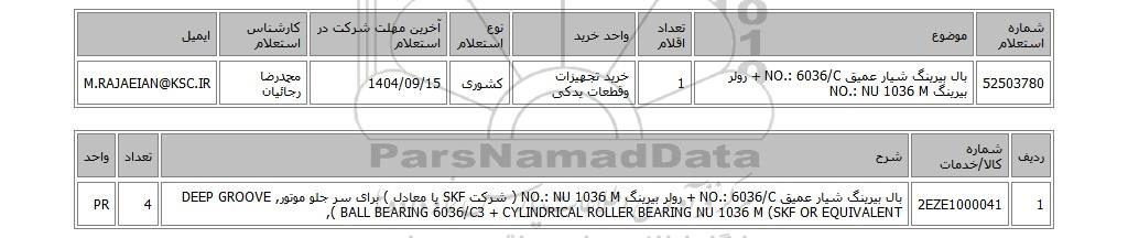 | 52503780 | بال بیرینگ شیار عمیق NO.: 6036/C + رولر بیرینگ NO.: NU 1036 M | 1 | خرید تجهیزات وقطعات یدکی | کشوری | 1404/09/15 | محمدرضا رجائیان | M.RAJAEIAN@KSC.IR |