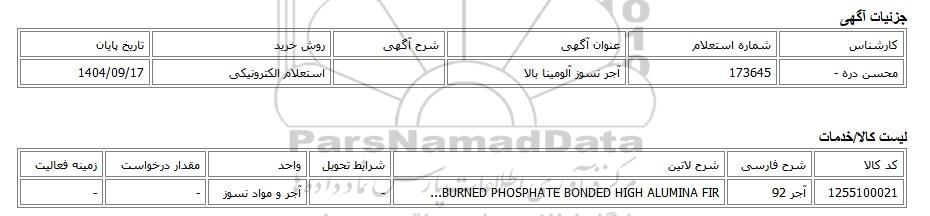 | محسن دره - | 173645 | آجر نسوز آلومینا بالا | استعلام الکترونیکی | 1404/09/17 |