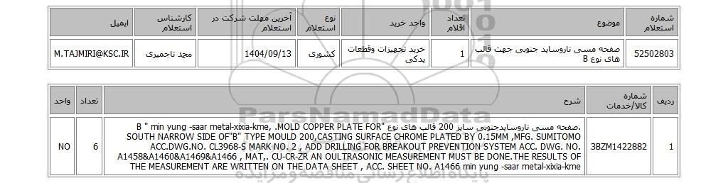 | 52502803 | صفحه مسی ناروساید جنوبی جهت قالب های نوع B | 1 | خرید تجهیزات وقطعات یدکی | کشوری | 1404/09/13 | محمد تاجمیری | M.TAJMIRI@KSC.IR |