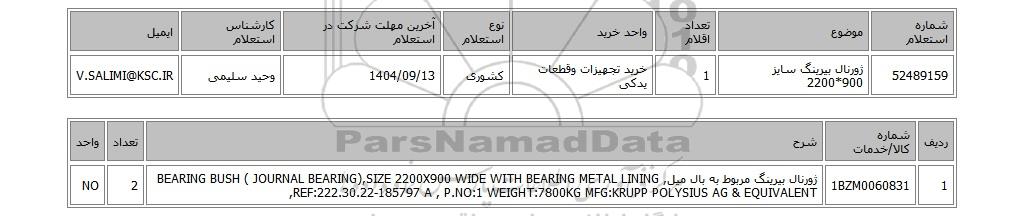| 52489159 | ژورنال بیرینگ سایز 900*2200 | 1 | خرید تجهیزات وقطعات یدکی | کشوری | 1404/09/13 | وحید سلیمی | V.SALIMI@KSC.IR |