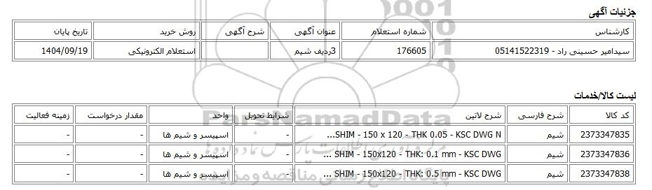 | سیدامیر حسینی راد - 05141522319 | 176605 | 3ردیف شیم | استعلام الکترونیکی | 1404/09/19 |