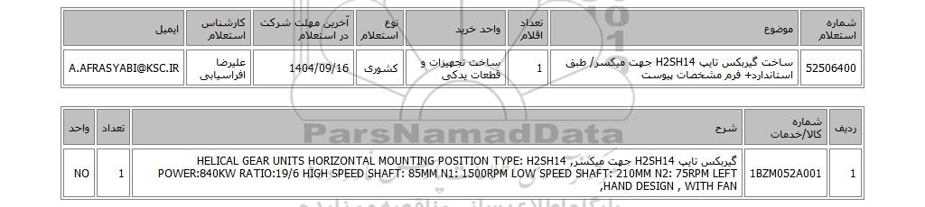 | 52506400 | ساخت گیربکس تایپ H2SH14 جهت میکسر/ طبق استاندارد+ فرم مشخصات پیوست | 1 | ساخت تجهیزات و قطعات یدکی | کشوری | 1404/09/16 | علیرضا افراسیابی | A.AFRASYABI@KSC.IR |