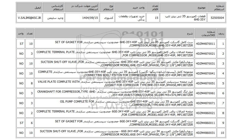 | 52505004 | قطعات کمپرسور 35 تنی بیتزر تایپ 6HE-35Y | 15 | خرید تجهیزات وقطعات یدکی | کشوری | 1404/09/15 | وحید سلیمی | V.SALIMI@KSC.IR |