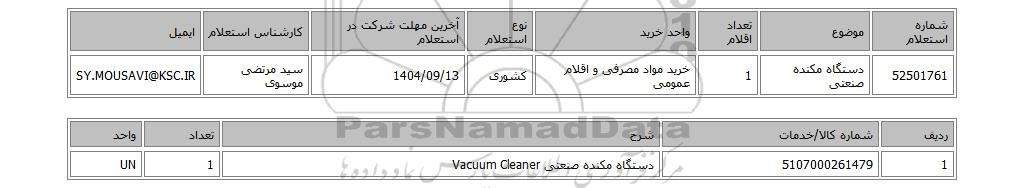 | 52501761 | دستگاه مکنده صنعتی | 1 | خرید مواد مصرفی و اقلام عمومی | کشوری | 1404/09/13 | سید مرتضی موسوی | SY.MOUSAVI@KSC.IR |
