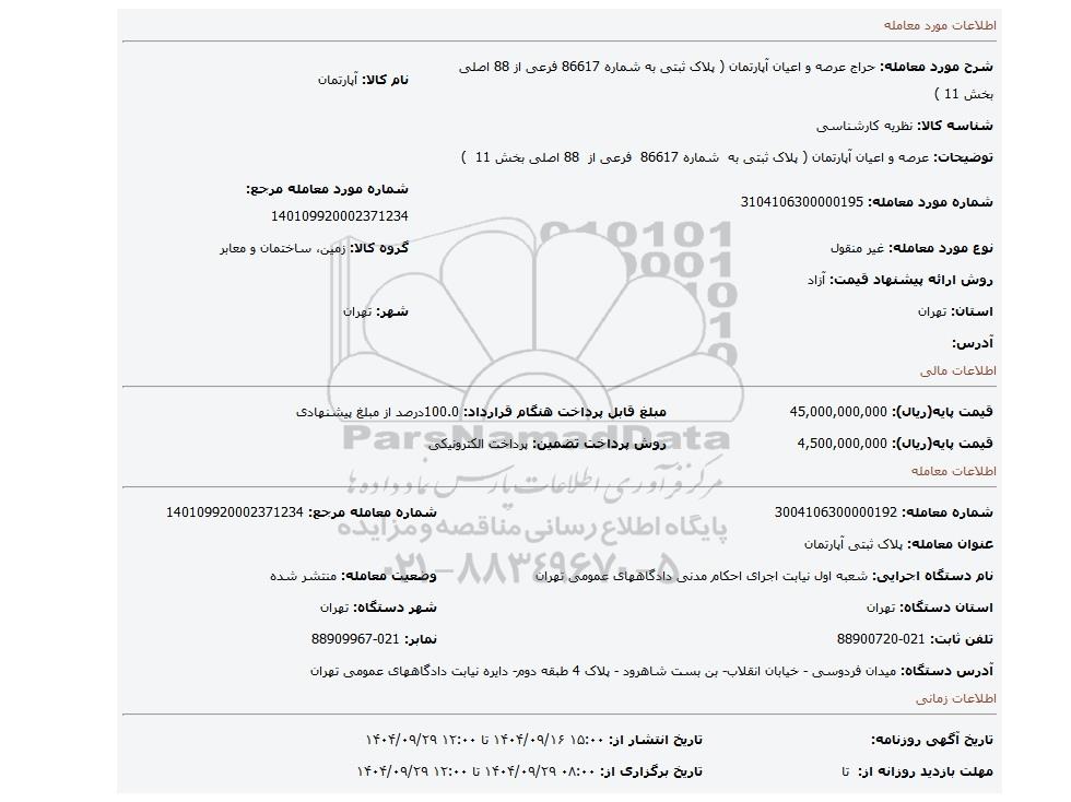 | شرح مورد معامله: حراج عرصه و اعیان آپارتمان ( پلاک ثبتی به شماره 86617 فرعی از 88 اصلی بخش 11 ) | نام کالا: آپارتمان | |