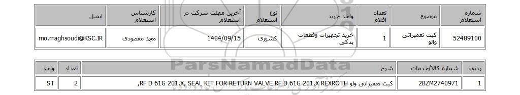 | 52489100 | کیت تعمیراتی والو | 1 | خرید تجهیزات وقطعات یدکی | کشوری | 1404/09/15 | محمد مقصودی | mo.maghsoudi@KSC.IR |