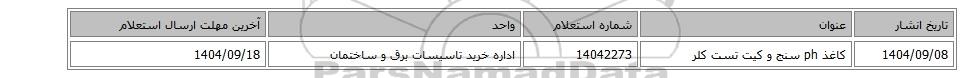 | 1404/09/08 | کاغذ ph سنج و کیت تست کلر | 14042273 | اداره خرید تاسیسات برق و ساختمان | 1404/09/18 |