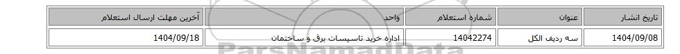 | 1404/09/08 | سه ردیف الکل | 14042274 | اداره خرید تاسیسات برق و ساختمان | 1404/09/18 |
