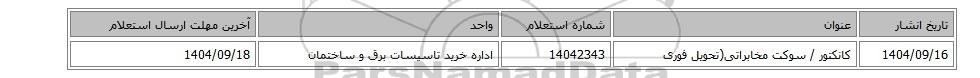 | 1404/09/16 | کانکتور / سوکت مخابراتی(تحویل فوری | 14042343 | اداره خرید تاسیسات برق و ساختمان | 1404/09/18 |