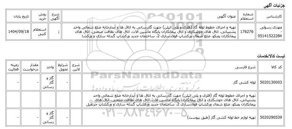 | 5020290539 | تهیه لوازم خط لوله کشی گاز (طبق پیوست) | - | گاز و گاز رسانی | - | - |