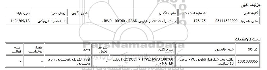 | علی ناصرنیا - 05141522299 | 176475 | داکت برق شکافدار تابلویی RWD 100*60 ، RAAD ، | استعلام الکترونیکی | 1404/09/18 |