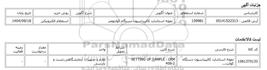 | آرش قائمی - 05141522313 | 159981 | نمونه استاندارد کالیبراسیون دستگاه کوانتومتر | استعلام الکترونیکی | 1404/09/18 |