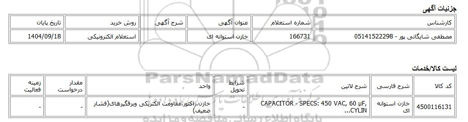 | مصطفی شایگانی پور - 05141522298 | 166731 | خازن استوانه ای | استعلام الکترونیکی | 1404/09/18 |