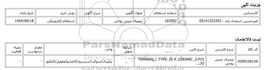 | امیرحسین اسعدی نژاد - 05141522302 | 163597 | ترمینال چینی زوجی | استعلام الکترونیکی | 1404/09/18 |