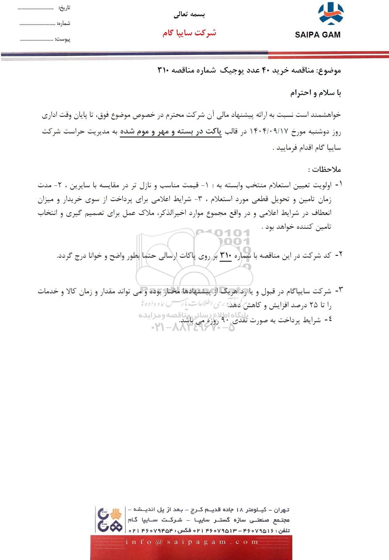 خواهشمند است نسبت به ارائه پیشنهاد مالی آن شرکت محترم در خصوص موضوع فوق، تا پایان وقت اداری روز دوشنبه مورخ 1404.09.17 در قالب پاکت در بسته و مهر و موم شده به مدیریت حراست شرکت سایپا گام اقدام فرمایید .