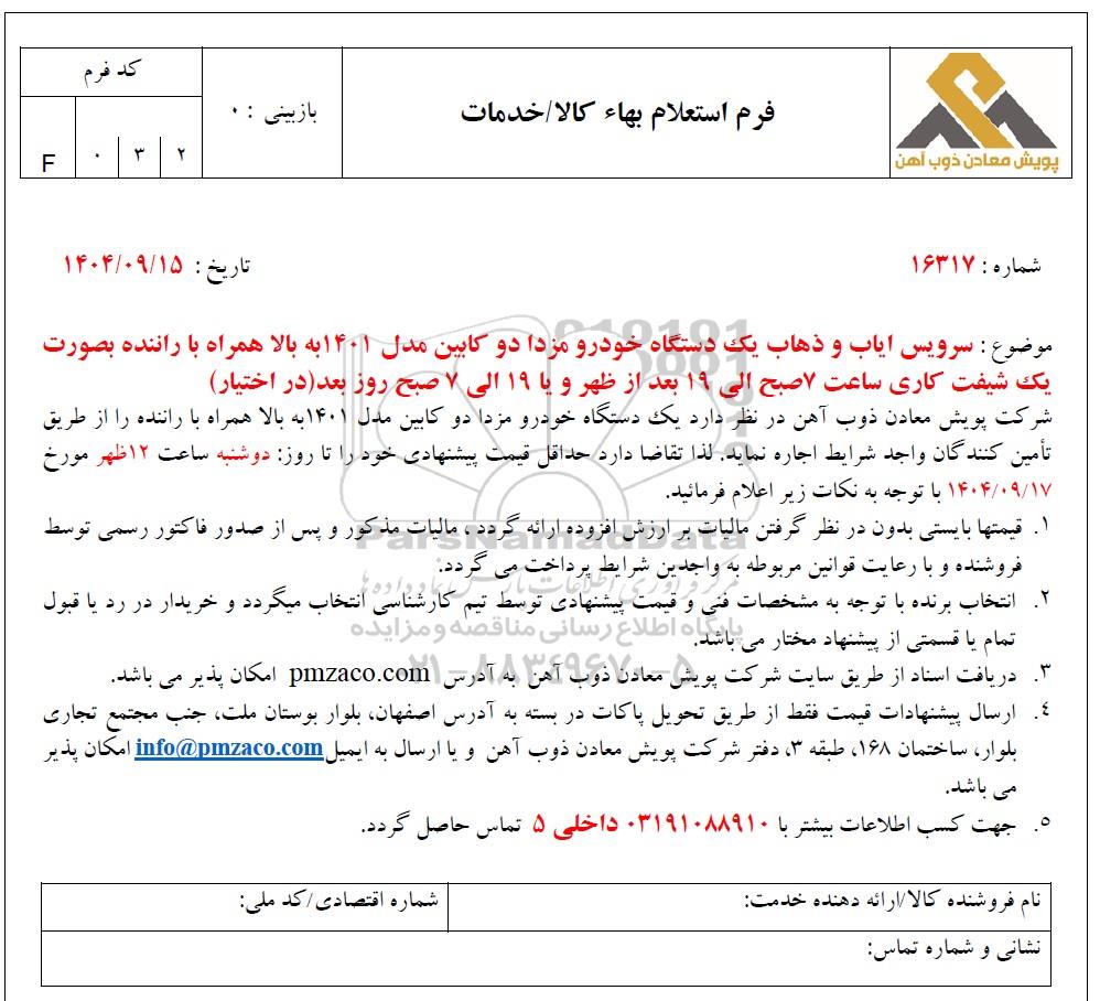 شرکت پویش معادن ذوب آهن در نظر دارد یک دستگاه خودرو مزدا دو کابین مدل 1401 به بالا همراه با راننده را از طریق تأمین کنندگان واجد شرایط اجاره نماید. لذا تقاضا دارد حداقل قیمت پیشنهادی خود را تا روز: دوشنبه ساعت 12 ظهر مورخ 1404.09.17 با توجه به نکات زیر اعلام فرمائید.