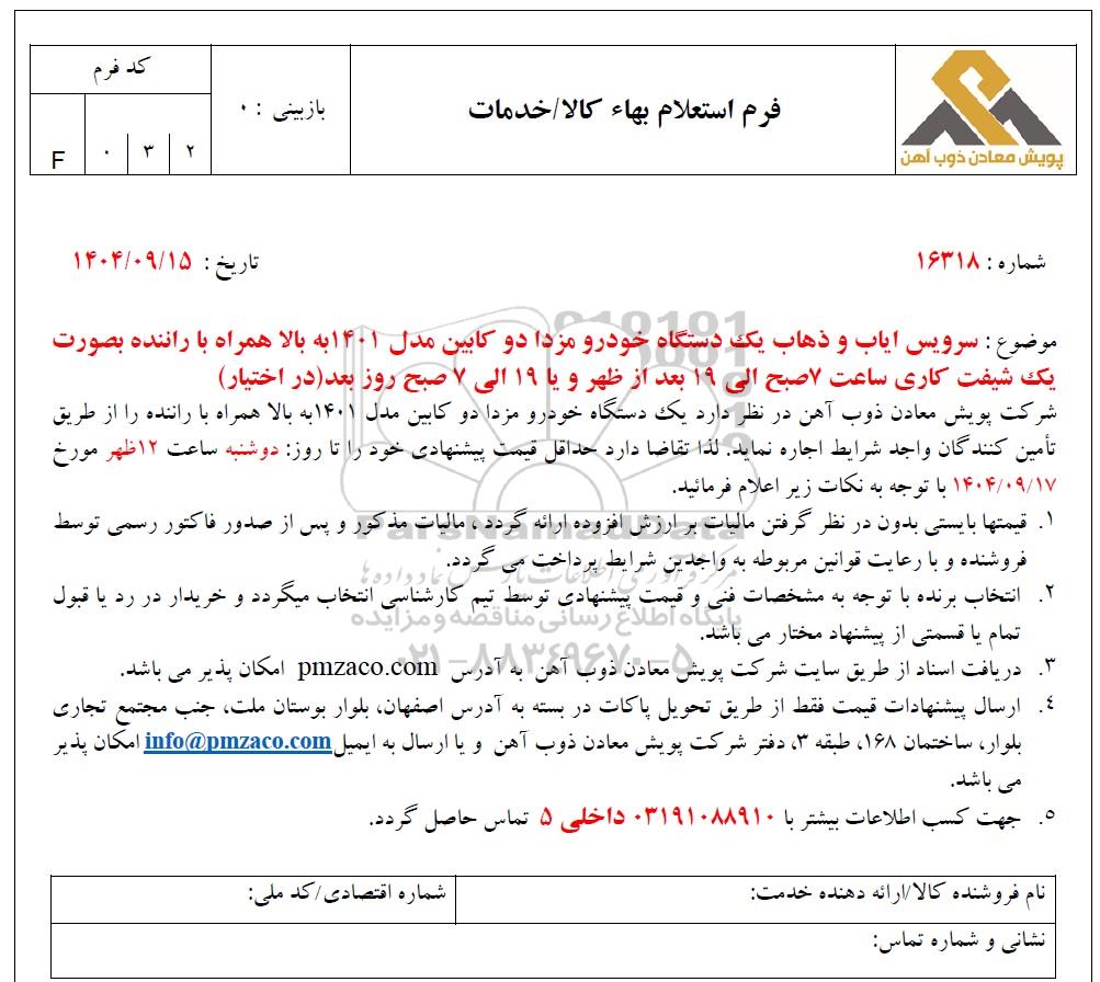 شرکت پویش معادن ذوب آهن در نظر دارد یک دستگاه خودرو مزدا دو کابین مدل 1401 به بالا همراه با راننده را از طریق تأمین کنندگان واجد شرایط اجاره نماید. لذا تقاضا دارد حداقل قیمت پیشنهادی خود را تا روز: دوشنبه ساعت 12 ظهر مورخ 1404.09.17 با توجه به نکات زیر اعلام فرمائید.