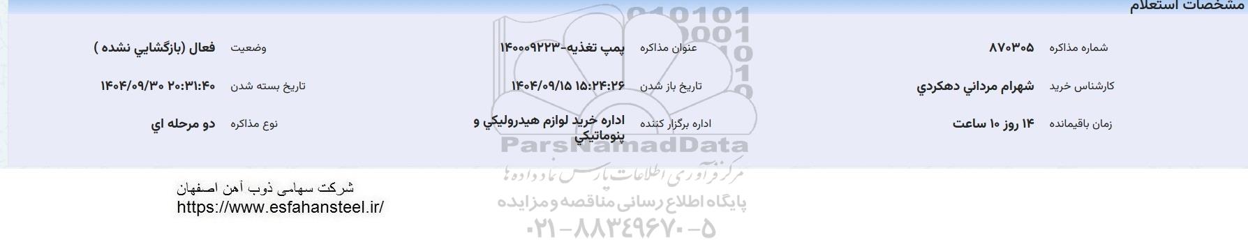 عنوان مذاکره: استعلام پمپ تغذیه - 140009223