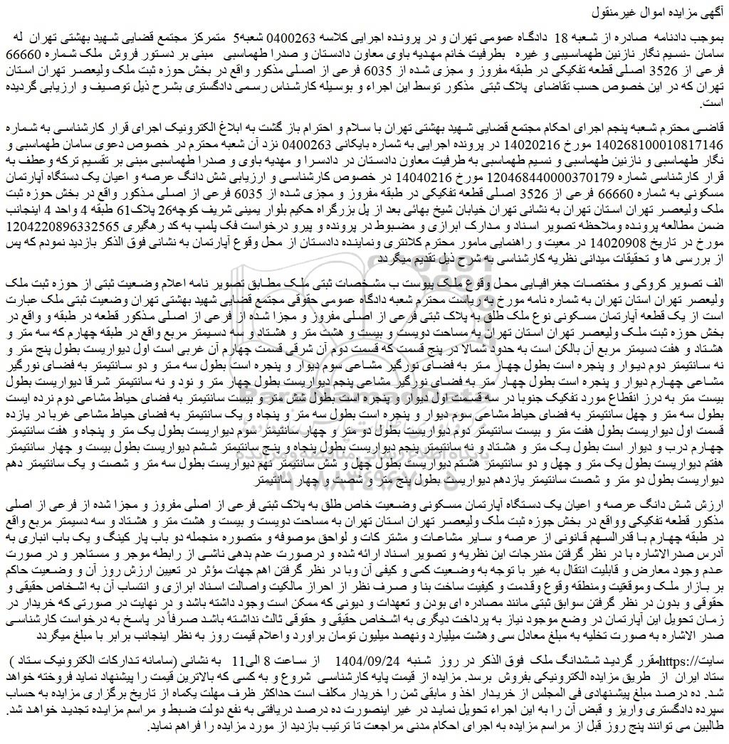 بموجب دادنامه صادره از شعبه 18 دادگاه عمومی تهران و در پرونده اجرایی کلاسه 0400263 شعبه5 متمرکز مجتمع قضایی شهید بهشتی تهران له سامان -نسیم نگار نازنین طهماسیبی و غیره بطرفیت خانم مهدیه باوی معاون دادستان و صدرا طهماسبی مبنی بر دستور فروش ملک شماره 66660 فرعی از 3526 اصلی قطعه تفکیکی در طبقه مفروز و مجزی شده از 6035 فرعی از اصلی مذکور واقع در بخش حوزه ثبت ملک ولیعصر تهران استان تهران که در این خصوص حسب تقاضای پلاک ثبتی مذکور توسط این اجراء و بوسیله کارشناس رسمی دادگستری بشرح ذیل توصیف و ارزیابی گردیده است.