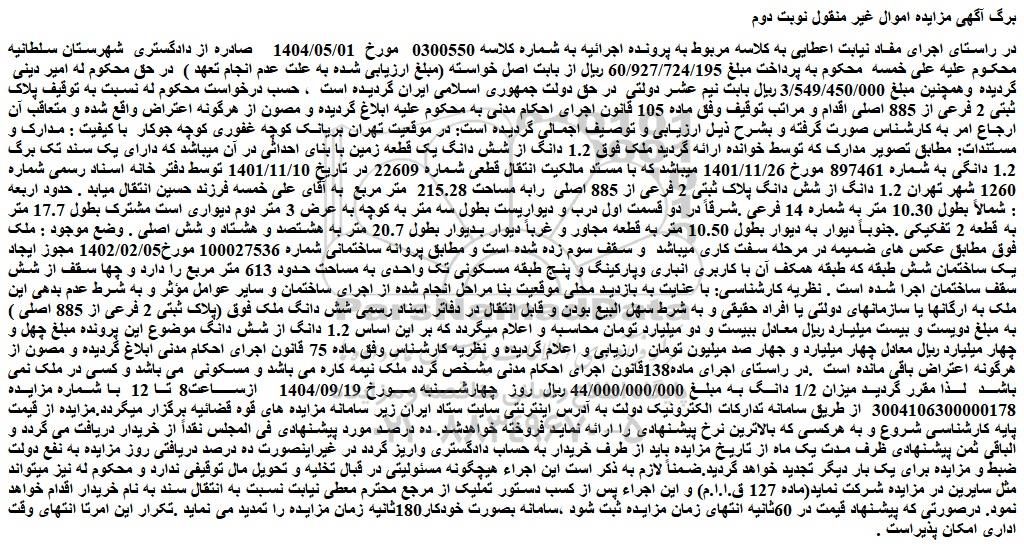 در راستای اجرای مفاد نیابت اعطایی به کلاسه مربوط به پرونده اجرائیه به شماره کلاسه 0300550 مورخ 1404/05/01 صادره از دادگستری شهرستان سلطانیه محکوم علیه علی خمسه محکوم به پرداخت مبلغ 60/927/724/195 ریال از بابت اصل خواسته (مبلغ ارزیابی شده به علت عدم انجام تعهد ) در حق محکوم له امیر دینی گردیده وهمچنین مبلغ 3/549/450/000 ریال بابت نیم عشر دولتی در حق دولت جمهوری اسلامی ایران گردیده است ، حسب درخواست محکوم له نسبت به توقیف پلاک ثبتی 2 فرعی از 885 اصلی اقدام و مراتب توقیف وفق ماده 105 قانون اجرای احکام مدنی به محکوم علیه ابلاغ گردیده و مصون از هرگونه اعتراض واقع شده و متعاقب آن ارجاع امر به کارشناس صورت گرفته و بشرح ذیل ارزیابی و توصیف اجمالی گردیده است: در موقعیت تهران بریانک کوچه غفوری کوچه جوکار با کیفیت : مدارک و مستندات: مطابق تصویر مدارک که توسط خوانده ارائه گردید ملک فوق 1.2 دانگ از شش دانگ یک قطعه زمین با بنای احداثی در آن میباشد که دارای یک سند تک برگ 1.2 دانگی به شماره 897461 مورخ 1401/11/26 میباشد که با مستد مالکیت انتقال قطعی شماره 22609 در تاریخ 1401/11/10 توسط دفتر خانه اسناد رسمی شماره 1260 شهر تهران 1.2 دانگ از شش دانگ پلاک ثبتی 2 فرعی از 885 اصلی رابه مساحت 215.28 متر مربع به آقای علی خمسه فرزند حسین انتقال میابد . حدود اربعه : شمالاً بطول 10.30 متر به شماره 14 فرعی .شرقاً در دو قسمت اول درب و دیواریست بطول سه متر به کوچه به عرض 3 متر دوم دیواری است مشترک بطول 17.7 متر به قطعه 2 تفکیکی .جنوباً دیوار به دیوار بطول 10.50 متر به قطعه مجاور و غرباً دیوار بدیوار بطول 20.7 متر به هشتصد و هشتاد و شش اصلی . وضع موجود : ملک فوق مطابق عکس های ضمیمه در مرحله سفت کاری میباشد و سقف سوم زده شده است و مطابق پروانه ساختمانی شماره 100027536 مورخ1402/02/05 مجوز ایجاد یک ساختمان شش طبقه که طبقه همکف آن با کاربری انباری وپارکینگ و پنج طبقه مسکونی تک واحدی به مساحت حدود 613 متر مربع را دارد و چها سقف از شش سقف ساختمان اجرا شده است . نظریه کارشناسی: با عنایت به بازدید محلی موقعیت بنا مراحل انجام شده از اجرای ساختمان و سایر عوامل مؤثر و به شرط عدم بدهی این ملک به ارگانها یا سازمانهای دولتی یا افراد حقیقی و به شرط سهل البیع بودن و قابل انتقال در دفاتر اسناد رسمی شش دانگ ملک فوق (پلاک ثبتی 2 فرعی از 885 اصلی ) به مبلغ دویست و بیست میلیارد ریال معادل ببیست و دو میلیارد تومان محاسبه و اعلام میگردد که بر این اساس 1.2 دانگ از شش دانگ موضوع این پرونده مبلغ چهل و چهار میلیارد ریال معادل چهار میلیارد و جهار صد میلیون تومان ارزیابی و اعلام گردیده و نظریه کارشناس وفق ماده 75 قانون اجرای احکام مدنی ابلاغ گردیده و مصون از هرگونه اعتراض باقی مانده است .در راستای اجرای ماده138قانون اجرای احکام مدنی مشخص گردد ملک نیمه کاره می باشد و مسکونی می باشد و کسی در ملک نمی باشد لذا مقرر گردید میزان 1/2 دانگ به مبلغ 44/000/000/000 ریال روز چهارشنبه مورخ 1404/09/19 ازساعت8 تا 12 با شماره مزایده 3004106300000178 از طریق سامانه تدارکات الکترونیک دولت به آدرس اینترنتی سایت ستاد ایران زیر سامانه مزایده های قوه قضائیه برگزار میگردد.مزایده از قیمت پایه کارشناسی شروع و به هرکسی که بالاترین نرخ پیشنهادی را ارائه نماید فروخته خواهدشد. ده درصد مورد پیشنهادی فی المجلس نقداً از خریدار دریافت می گردد و الباقی ثمن پیشنهادی ظرف مدت یک ماه از تاریخ مزایده باید از طرف خریدار به حساب دادگستری واریز گردد در غیراینصورت ده درصد دریافتی روز مزایده به نفع دولت ضبط و مزایده برای یک بار دیگر تجدید خواهد گردید.ضمناً لازم به ذکر است این اجراء هیچگونه مسئولیتی در قبال تخلیه و تحویل مال توقیفی ندارد و محکوم له نیز میتواند مثل سایرین در مزایده شرکت نماید(ماده 127 ق.ا.ا.م) و این اجراء پس از کسب دستور تملیک از مرجع محترم معطی نیابت نسبت به انتقال سند به نام خریدار اقدام خواهد نمود. درصورتی که پیشنهاد قیمت در 60ثانیه انتهای زمان مزایده ثبت شود ،سامانه بصورت خودکا