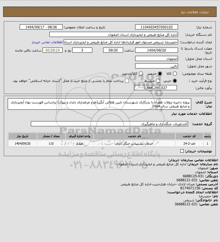 شرح کلی نیاز: پروژه ذخیره نزولات همراه با بذرکاری شهرستان نایین هلالی آبگیر(طرح مرتعداری دلدل و پیوک) براساس فهرست بهاء آبخیزداری و منابع طبیعی سال 1404