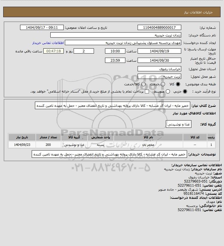 شرح کلی نیاز: خمیر مایه - ایران کد مشابه - کالا دارای پروانه بهداشتی و تاریخ انقضای معتبر - حمل به عهده تامین کننده
