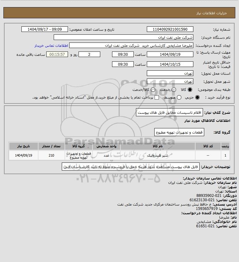 شرح کلی نیاز: اقلام تاسیسات مطابق فایل های پیوست