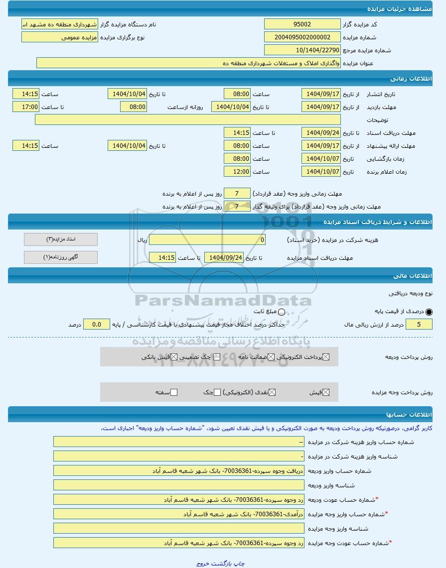 | شماره مال | 2104095002000005 | نوع برگزاری مزایده | مزایده عمومی | |