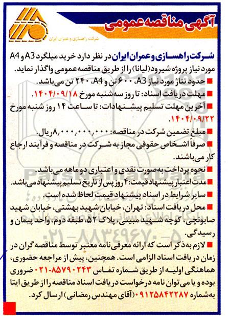 شرکت راهسازی و عمران ایران در نظر دارد خرید میلگرد A3 , A4 مورد نیاز پروژه شیرود (لیانا) را از طریق مناقصه عمومی واگذار نماید.