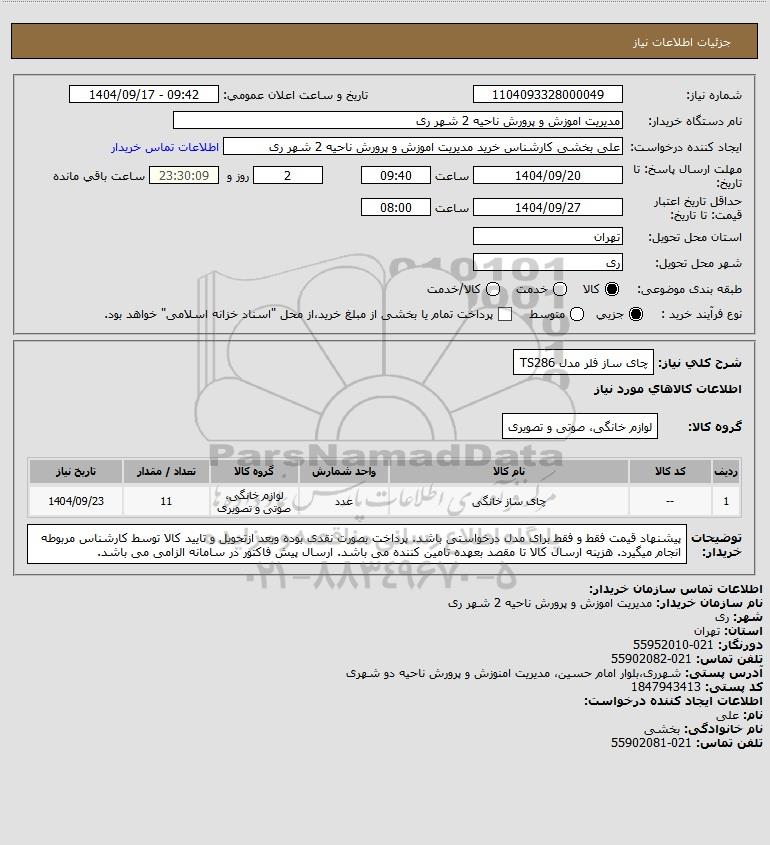 شرح کلی نیاز: چای ساز فلر مدل TS286