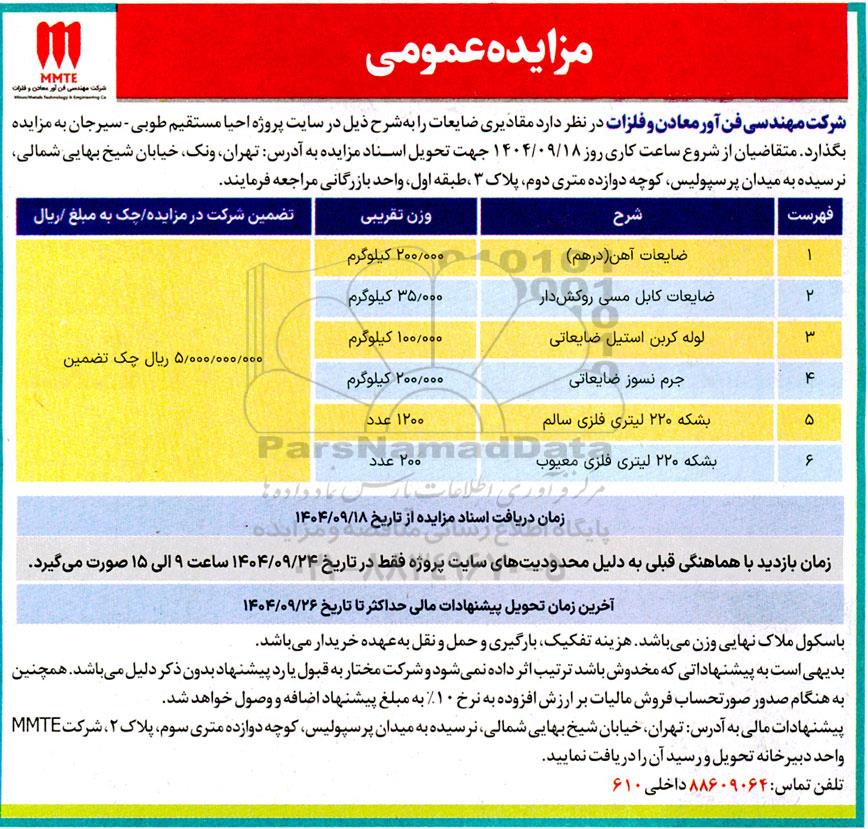 شرکت مهندسی فن آور معادن و فلزات در نظر دارد مقادیری ضایعات را به شرح ذیل در سایت پروژه احیا مستقیم طوبی -سیرجان به مزایده بگذارد متقاضیان از شروع ساعت کاری روز 1404.09.18 جهت تحویل اسناد مزایده به آدرس: تهران ونک، خیابان شیخ بهایی شمالی، نرسیده به میدان پرسپولیس، کوچه دوازده متری دوم، پلاک سوم، طبقه اول، واحد بازرگانی مراجعه فرمایند.