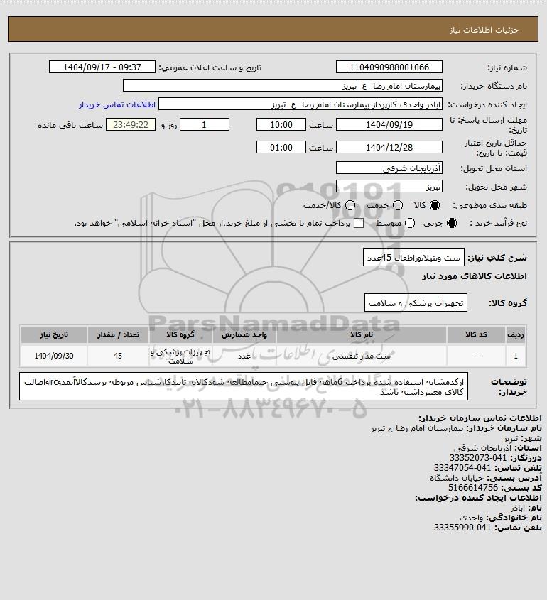شرح کلی نیاز: ست ونتیلاتوراطفال 45عدد