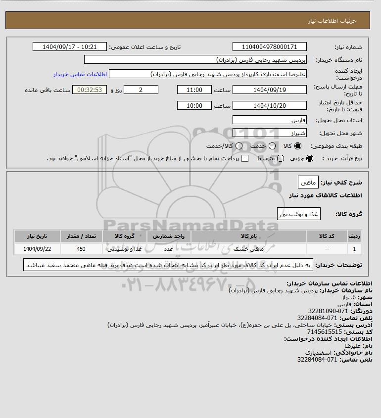 نام دستگاه خریدار:پردیس شهید رجایی فارس (برادران)