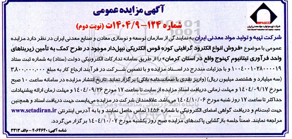 شرکت تهیه و تولید مواد معدنی ایران به نمایندگی از سازمان توسعه و نوسازی معادن و صنایع معدنی ایران در نظر دارد مزایده عمومی با موضوع فروش انواع الکترود گرافیتی کوره قوس الکتریکی نیپل دار موجود در طرح کمک به تأمین زیر بناهای واحد فرآوری تیتانیوم کهنوج واقع در استان کرمان را از طریق سامانه تدارکات الکترونیکی دولت (ستاد) به شماره ثبت ستاد 1004001028000019  و با جزئیات مندرج در اسناد مزایده و با تضمین شرکت در فرآیند ارجاع کار به مبلغ 3.800.000.000 سه میلیارد و هشتصد میلیون ریال واریز نقدی با ضمانت نامه بانکی برگزار نماید تاریخ انتشار مزایده در سامانه ساعت 10 صبح مورخ 1404.09.17 و مهلت زمانی دریافت اسناد مزایده از سایت تا ساعت 17 مورخ 1404.09.26 و مهلت زمان ارائه پیشنهادات حداکثر تا ساعت 17 روز شنبه مورخ 1404.10.06 می باشد. علاقمندان شرکت در مزایده می بایست جهت دریافت اسناد و همچنین جهت ثبت نام و دریافت گواهی امضای الکترونیکی با شماره 1456 تماس حاصل نمایند و یا به آدرس اینترنتی سایت ستاد ایران  مراجعه نمایند. ضمنا جلسه بازگشایی پاکتهای مزایده صبح روز یکشنبه مورخ 1404.10.07 برگزار می گردد.