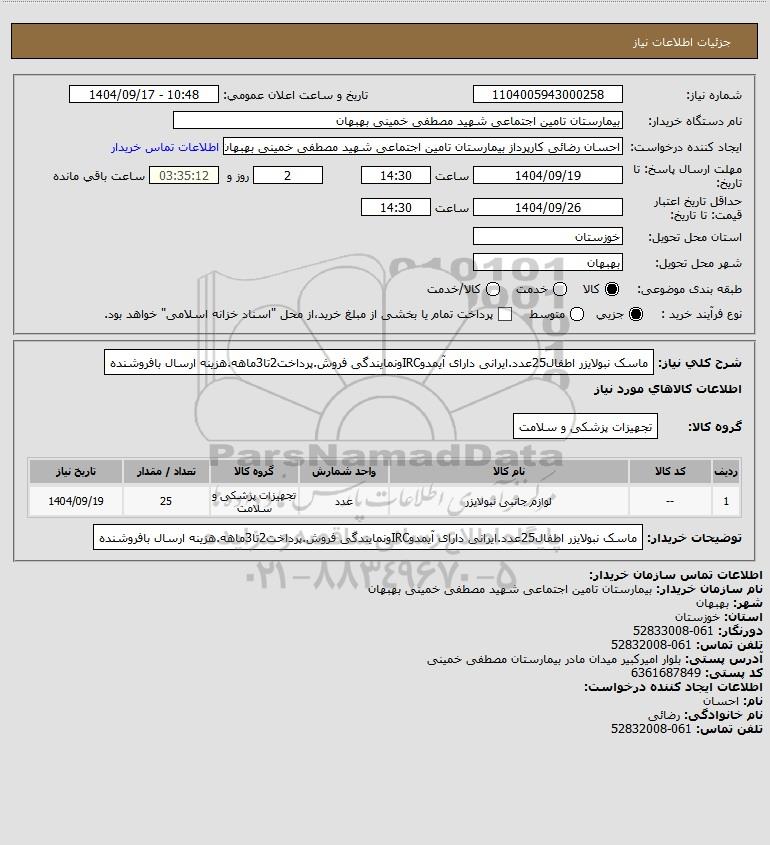 نام دستگاه خریدار:بیمارستان تامین اجتماعی شهید مصطفی خمینی بهبهان