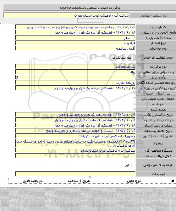 مناقصه (۶۳ت/۱۴۰۴)تجدید- عملیات یکپارچه تامین منابع مالی و تهیه و اجرای شبکه جمع اوری فاضلاب و از کلیه افراد متخصص و شرکتها واجد شرایط دعوت به عمل میآید در مناقصه با کد خبرگزاری پارس نماد: 9962795 شرکت نمایند.