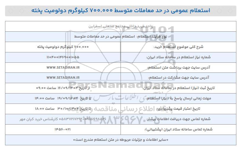 استعلام عمومی در حد معاملات متوسط 700.000 کیلوگرم دولومیت پخته