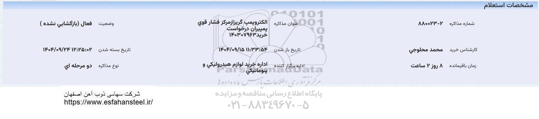 عنوان مذاکره : الکتروپمپ گریز از مرکز فشار قوی پمپیران درخواست خرید 140307963