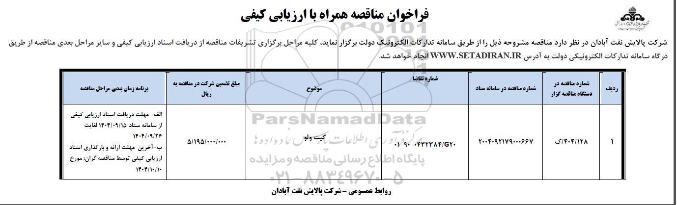 فراخوان مناقصه گیت ولو از کلیه افراد متخصص و شرکتها واجد شرایط دعوت به عمل میآید در مناقصه با کد خبرگزاری پارس نماد: 9963539 شرکت نمایند.