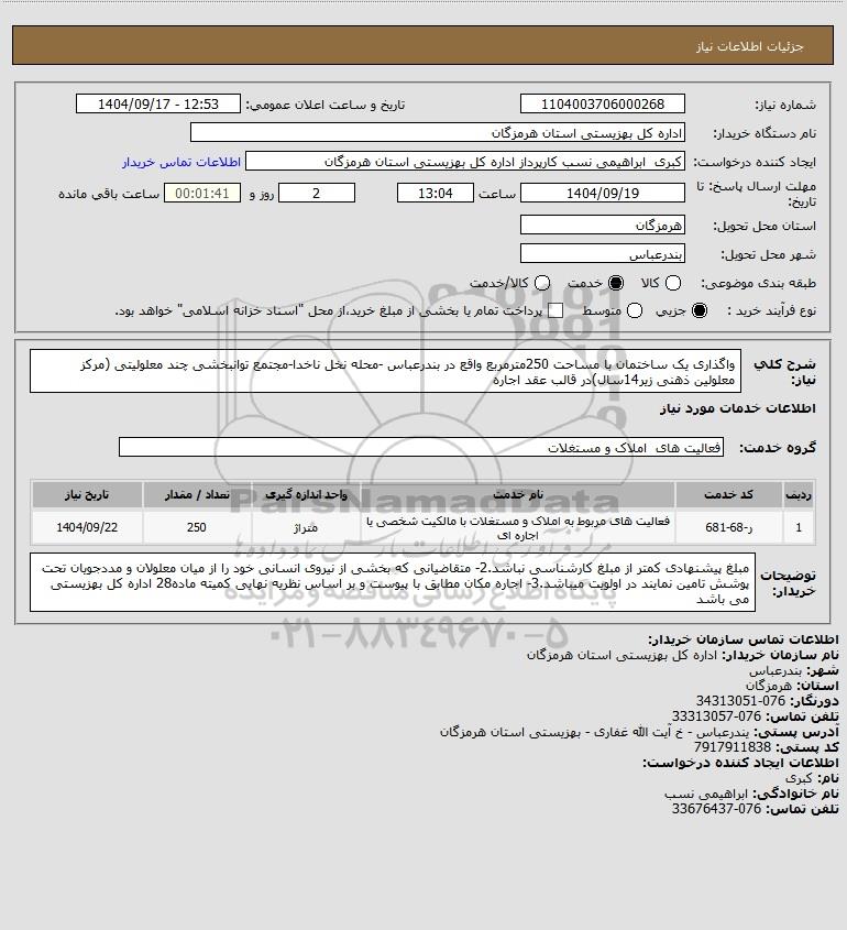 شرح کلی نیاز: واگذاری یک ساختمان با مساحت 250مترمربع واقع در بندرعباس -محله نخل ناخدا-مجتمع توانبخشی چند معلولیتی (مرکز معلولین ذهنی زیر14سال)در قالب عقد اجاره