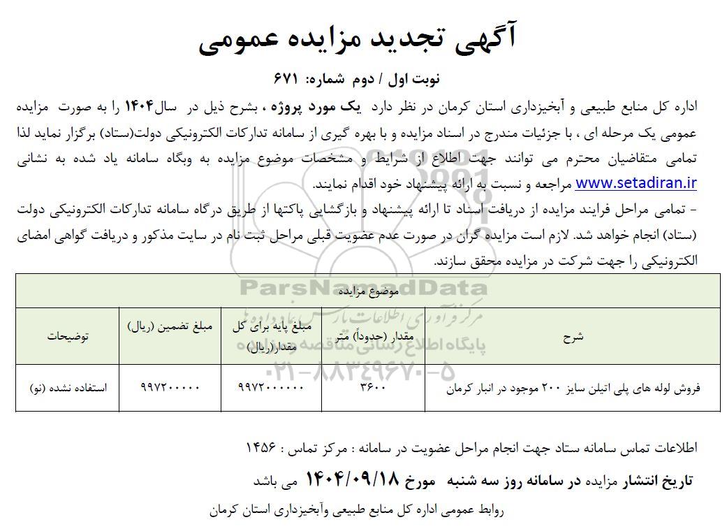اداره کل منابع طبیعی و آبخیزداری استان کرمان در نظر دارد یک مورد پروژه، بشرح ذیل در سال 1404 را به صورت مزایده عمومی یک مرحله ای، با جزئیات مندرج در اسناد مزایده و با بهره گیری از سامانه تدارکات الکترونیکی دولت (ستاد) برگزار نماید . لذا کلیه متقاضیان محترم می توانند جهت اطلاع از شرایط و مشخصات موضوع مزایده به وبگاه سامانه یاد شده به نشانی ستاد ایران مراجعه و نسبت به ارائه پیشنهاد خود اقدام نمایند.