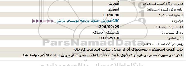 استعلام بها و موضوع استعلام استعلام, استعلام CNCآموزش اصول برنامه نويسی تراش به اطلاع کلیه شرکتها و افراد متخصص واجد شرایط میرساند، آگهی گذار در نظر دارد از طریق استعلام بها، نسبت به انتخاب و دریافت پیشنهادات اقدام نماید. این استعلام با کد آگهی ثبت شده در سامانه خبرگزاری پارس نماد : 996422 منتشر شده است. مشخصات استعلام : تاریخ شروع استعلام: 1396/09/21 آخرین مهلت ارسال پیشنهاد قیمت : 1396/09/29 و محل اجرای پروژه : استان اصفهان میباشد. استعلام قیمت مورد درخواست : استعلام, استعلام CNCآموزش اصول برنامه نويسی تراش با دستهبندیهای تخصصی و گروه های مرتبط : مشاوره تحقیقات و مدیریت استاندارد, استعلام اطلاع رسانی میگردد.